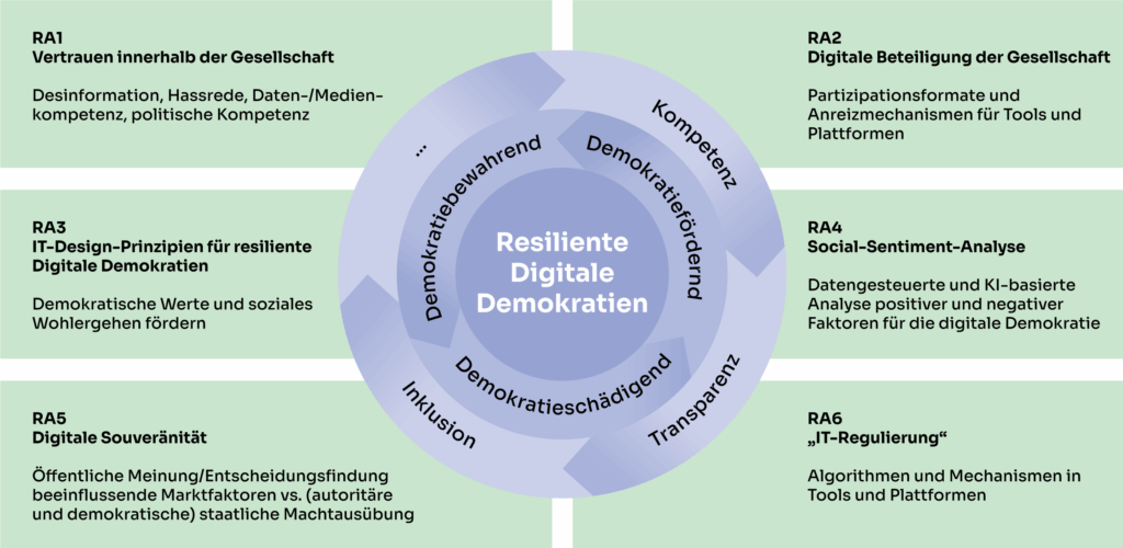 - Technologische Entwicklung – Gestaltung und Evaluation innovativer Plattformen, die demokratische Prozesse unterstützen oder die technologiegetriebene Demokratieforschung voranbringen
